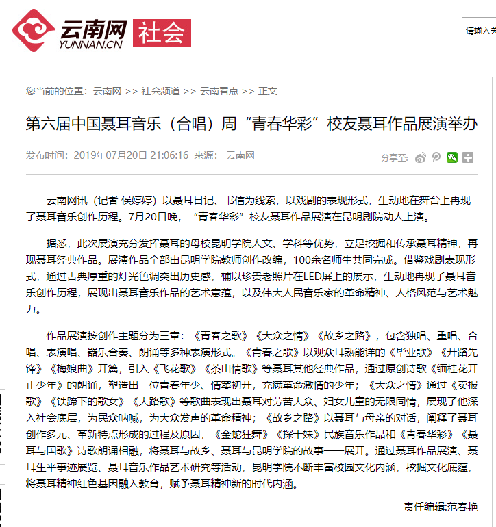 第六届中国聂耳音乐(合唱)周“青春华彩”校友聂耳作品展演举办