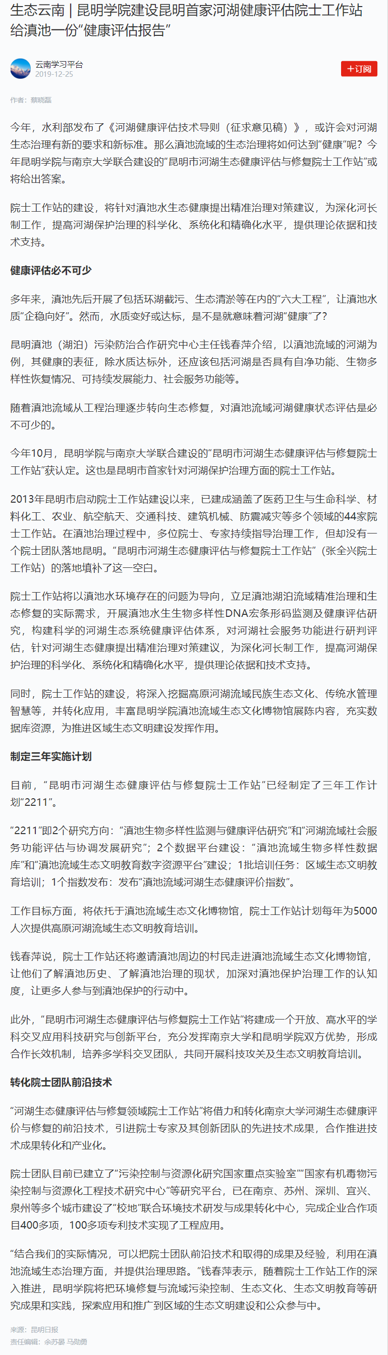 生态云南 | best365足球官网建设昆明首家河湖健康评估院士工作站 给滇池一份“健康评估报告”