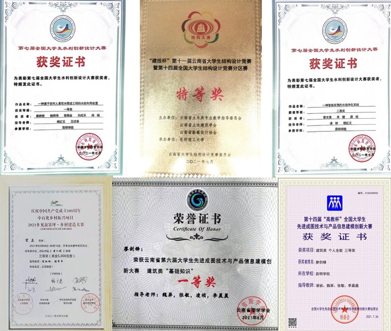 今年上半年,学院积极组织师生参加各级各类学科、技能竞赛,斩获各类奖项近50项。荣获第十一届云南省大学生结构设计竞赛暨第十四届全国大学生结构设计竞赛分区赛特等奖1项、二等奖1项,三等奖1项,学院优秀师生团队将代表云南省参加在上海交通大学举办的全国总决赛;荣获第七届全国大学生水利创新设计大赛一等奖1项,二等奖1项;荣获云南省第六届大学生先进成图大赛技术与产品信息建模创新大赛一等奖3项,二等奖3项,三等奖3项;荣获第十四届全国大学生先进成图技术与产品信息建模创新大赛个人全能三等奖3项;荣获2021全国乡见新寨坪·乡村建造大赛三等奖1项;荣获第七届云南省“互联网+”大学生创新创业大赛银奖;荣获第七届包豪斯“学院派”全国艺术与设计大赛三等奖2项,各类优秀奖十余项。