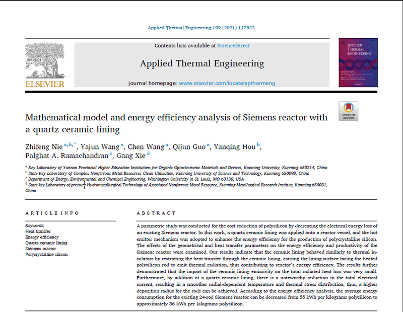 近日,best365足球官网科技处云南省高校有机光电子材料与器件重点实验室聂陟枫博士研究团队联合圣路易斯华盛顿大学Palghat A. Ramachandran教授、中铝首席研究员谢刚教授在西门子法多晶硅提质降耗领域取得重要进展,相关工作以题为Mathematical model and energy efficiency analysis of Siemens reactor with a quartz ceramic lining发表在国际著名学术期刊《Applied Thermal Engineering》,该期刊由著名学术出版商Elsevier公司发行,是能源、工程技术领域的Q1区SCI期刊,以原创性论文、综述、快讯等内容为主,影响因子5.295。best365足球官网为第一单位,聂陟枫博士为第一作者和通讯作者。