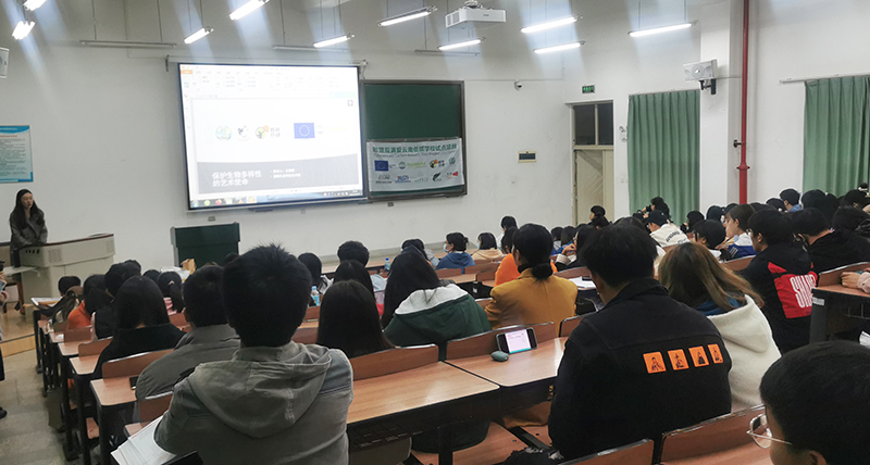 王馨曼博士介绍和展示了全球生物多样性面临的挑战和困境,呼吁用更易于接受和理解的如绘画、视频等艺术方式,唤起更多的人群特别是大学生群体加入到生物多样性保护中。讲座中,王馨曼博士与学生积极互动,穿插了问答、赠送其绘画作品等,课堂生动有趣,学生们的回答也给项目方和听课教师带来很多启示。