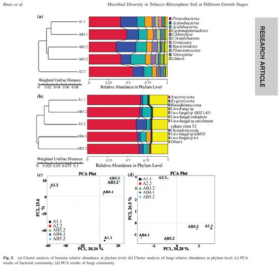 该研究论文以云南省重要经济作物烤烟为研究对象,通过Illumina MiSeq测序技术对其不同生长期根际土壤16S rDNAV4 - V5区及18S rRNAITS1区进行测序,在此基础上,分析、比较不同生长期烟草根际土壤微生物群落组成的差异。结果表明,田间条件下,烤烟根际土壤微生物群落丰度随作物生长而发生变化,并在现蕾期时其群落多样性达到峰值。其中,现蕾期与成熟期根际细菌群落结构组成及丰度相似度很高;而旺长期细菌群落特征呈现出较大差异;烟草现蕾期真菌群落与其他四个时期相似度非常低,团棵期与旺长期、成熟期与腐解期真菌群落结构及丰度相似性较高。本研究可为深入了解烟草根际土壤微生物多样性的变化规律以及这种变化与烟草土壤病害之间的相互关系提供理论依据。