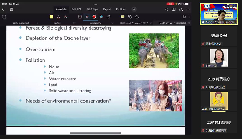 3月15日,对外合作交流处邀请泰国佛统皇家大学人文学院院长Nipon Chuamuanghan博士作主题为《泰国健康与保健旅游》的线上讲座,近300余名师生参与交流活动。