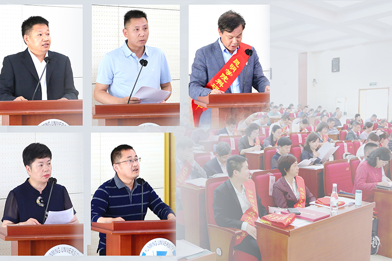 科学技术奖励获奖者代表农学与生命科学学院余磊教授,二级学院代表农学与生命科学学院院长夏体渊、物理科学与技术学院院长杨海、学前与特殊教育学院院长唐敏,科研团队代表化学化工学院鞠海东教授分别作交流发言。