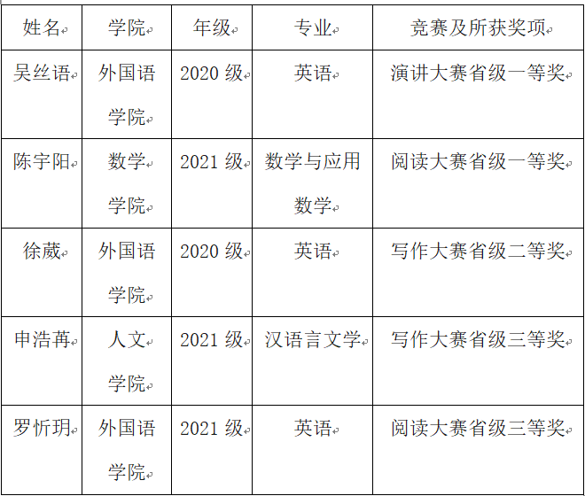 11月4日,2022年“外研社·国才杯”全国英语演讲大赛云南赛区决赛暨写作、阅读大赛颁奖典礼在昆明理工大学举行,best365外国语学院2020级英语专业学生吴丝语等5位同学共获得省级一等奖2项、二等奖1项和三等奖2项。