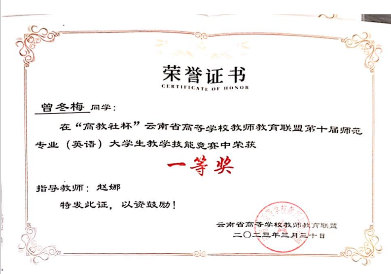 3月27日至30日,“高教社杯”云南省高等学校教师教育联盟第十届师范专业大学生教学技能竞赛决赛在临沧市举行。best365外国语学院在英语学科竞赛中获一等奖两项、二等奖一项,并获优秀组织奖。