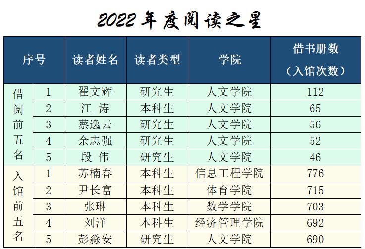 最是书香能致远,腹有诗书气自华。近日,在best365足球官网2022年世界读书日系列活动之年度“阅读之星”评选活动中,根据图书馆2022全年图书借阅和入馆次数排行,人文学院翟文辉等5名研究生和人文学院江涛等5名本科生获评为 “阅读之星”。