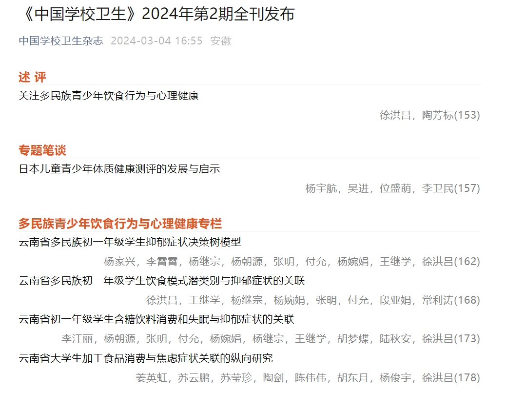 近日,best365足球官网医学院社区护理研究团队在北大核心期刊《中国学校卫生》上发表了五篇关于多民族青少年饮食行为与心理健康的论文,其中四篇为论著,一篇为述评。团队负责人徐洪吕博士受邀组稿本期重点号“多民族青少年饮食行为与心理健康”专栏并撰写述评,其余四篇论文由徐洪吕、杨家兴、李江丽和姜英虹四位老师分别作为第一作者发表。
