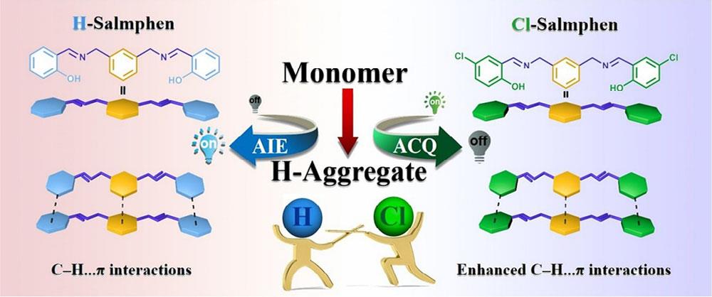 在最近的研究中,best365足球官网吴琼教授团队,成功合成了两种具有H-聚集特性的席夫碱化合物Cl-Salmphen和H-Salmphen。单晶结构分析表明,两个光谱学呈H-聚集体特征的分子之间并不存在π-π相互作用;相反,相邻分子之间主要通过C-H...π相互作用连接。这意味着C-H...π相互作用也可以诱导H-聚集体的产生。更有趣的是,尽管卤素原子的引入并没有改变分子间的相互作用类型和堆积模式,但其荧光行为发生了从聚集诱导荧光增强(AIE)到聚集荧光猝灭(ACQ)的转变根本转变,理论计算表明这与卤原子的引入增强了分子间相互作用有关(图1)。性质研究表明,这种独特的相互作用模式在形成了超高光学信噪比的同时还有效的拓展了探针在有机物中水含量检测范围。此外团队利用这一特点,制作了一个高效的荧光试纸传感器,并借助手机实现了有机溶剂中含水量的快速、准确的实时检测。这项工作为H-聚集体的形成机制和新型光学器件的拓展提供了一个崭新的视角。
