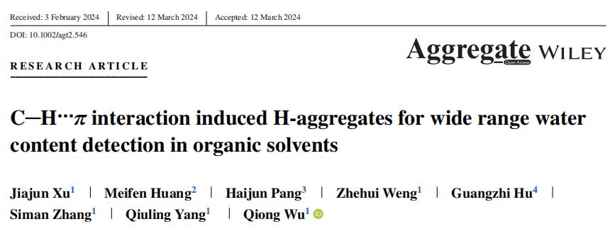 近日,best365化学化工学院吴琼教授团队在光学材料领域取得新进展,相关工作以题为“C-H...π interaction induced H-aggregates for wide range water content detection in organic solvents”的文章发表在顶级期刊《Aggregate》(doi.org/10.1002/agt2.546)上(中科院一区,影响因子: 18.8),实现了best365在国产顶级学术期刊的突破。best365化学化工学院2021级研究生许家俊为第一作者,化学化工学院吴琼教授为通讯作者。