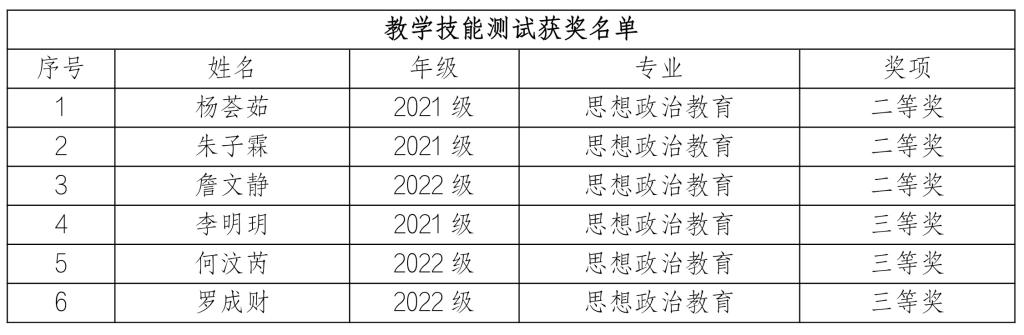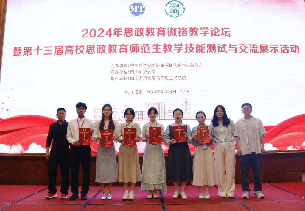 2024年思政教育微格教学论坛暨第十三届高校思政教育师范生教学技能测试与交流展示活动于5月24日至5月27日在四川师范大学举办。马克思主义学院选派2021级李明玥、杨荟茹、朱子霖和2022级何汶芮、罗成财、詹文静六名同学参加,荣获二等奖3项、三等奖3项。