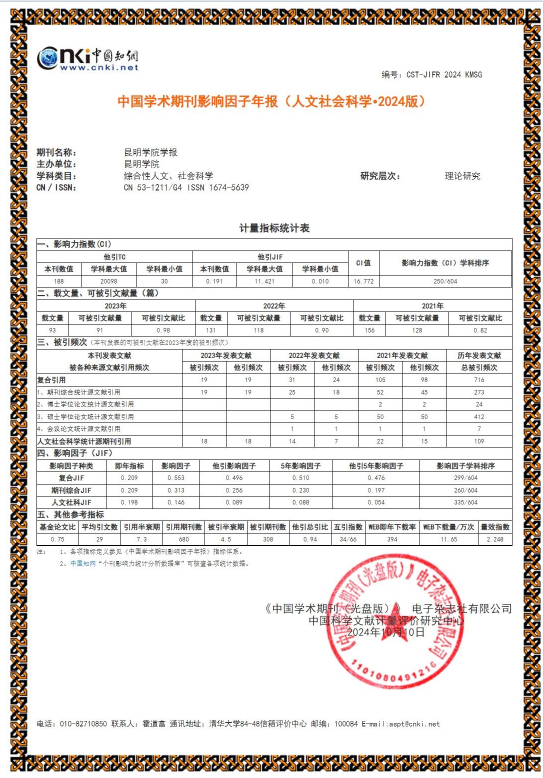 据中国知网最新发布的《中国学术期刊影响因子年报》(人文社会科学•2024版),《best365足球官网学报》影响因子数据及全国排位大幅提升:期刊综合影响因子为0.313,比2023年版的0.216提升45%;复合影响因子0.553,比2023年版的0.492提升12.4%;影响力指数在全国社科综合类期刊中排位为250/604,比2023年版的268位提升了18位。影响因子在云南省文理综合刊中排名第一。