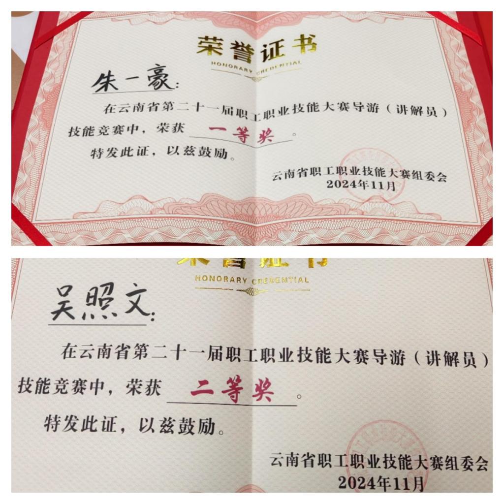 11月29日,云南省第二十一届职工职业技能大赛导游(讲解员)技能竞赛总决赛在保山腾冲圆满落幕。旅游学院(现代旅游餐饮产业学院)2023级旅游管理专升本班朱一豪同学以总分第一的成绩获得一等奖,同时荣获“云南省技术状元”称号;2023级酒店管理专升本班吴照文同学获得二等奖,同时获得“云南省技术能手”称号。