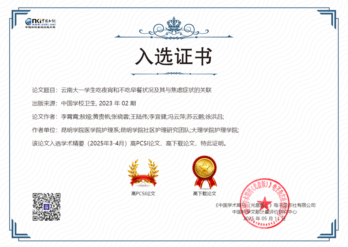 近日,医学院本科生李霄霄以第一作者身份发表的论文《云南大一学生吃夜宵和不吃早餐状况及其与焦虑症状的关联》,入选中国知网《中国学术精要》“高PCSI论文”及“高下载论文”榜单。该论文发表于预防医学与卫生学领域TOP1期刊《中国学校卫生杂志》(北大中文核心期刊)2023年02期,通讯作者为徐洪吕博士。
