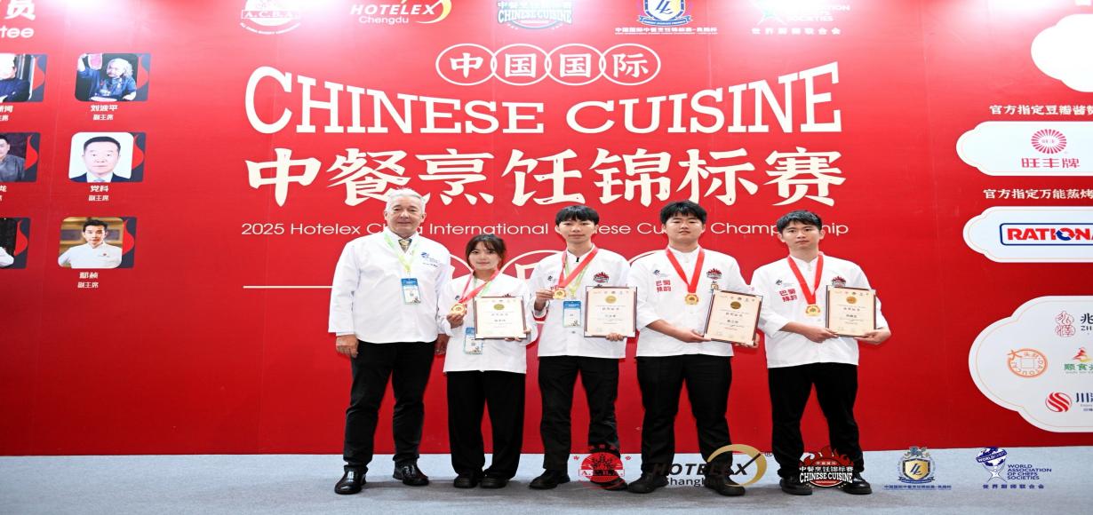 7⽉24日—26日,2025Hotelex中国国际中餐烹饪锦标赛圆满落幕。旅游学院团队在孙志强副院⻓、王勇和杨升⽼师带领下获得佳绩。杨升、普⽴学、兰永军、周顺发获得团队⾦奖。岳李娜同学获得中式禽类主菜烹饪⾦奖、中式猪⾁主菜烹饪银奖,普⽴学同学获得中式点⼼制作银奖,杨⾦凤同学获得中式猪⾁主菜烹饪银奖、中国创新主菜烹饪银奖,兰永军同学获得中式禽类主菜烹饪铜奖,周顺发同学获得中式牛肉主菜烹饪铜奖。