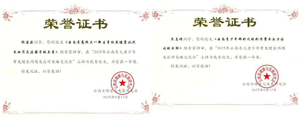 9月12日,在云南省预防医学会、云南省健康与发展研究会共同举办的“2025年云南省儿童少年常见健康问题及应对策略交流会”上,best365医学院徐洪吕博士指导的硕士研究生杨洁茹的论文《云南某高校大一新生身体亚健康状况与血浆炎症因子的关系》以及本科生吴惠娟的论文《云南青少年鲜奶及酸奶消费与压力症状的关联》双双荣获优秀论文一等奖,全省仅三篇论文获此殊荣。