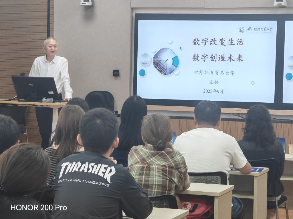 9月12日,对外经济贸易大学副校长王强教授在经济管理学院(自贸学院)开展了以《数字改变生活 数字创造未来》为题目的学术讲座。讲座由学校党委副书记、校长丁文丽教授主持。学校党委委员、副校长李剀,纪委书记、监察专员罗荣辉,经济管理学院主要领导、骨干教师以及部分国际商务硕士研究生聆听了讲座。