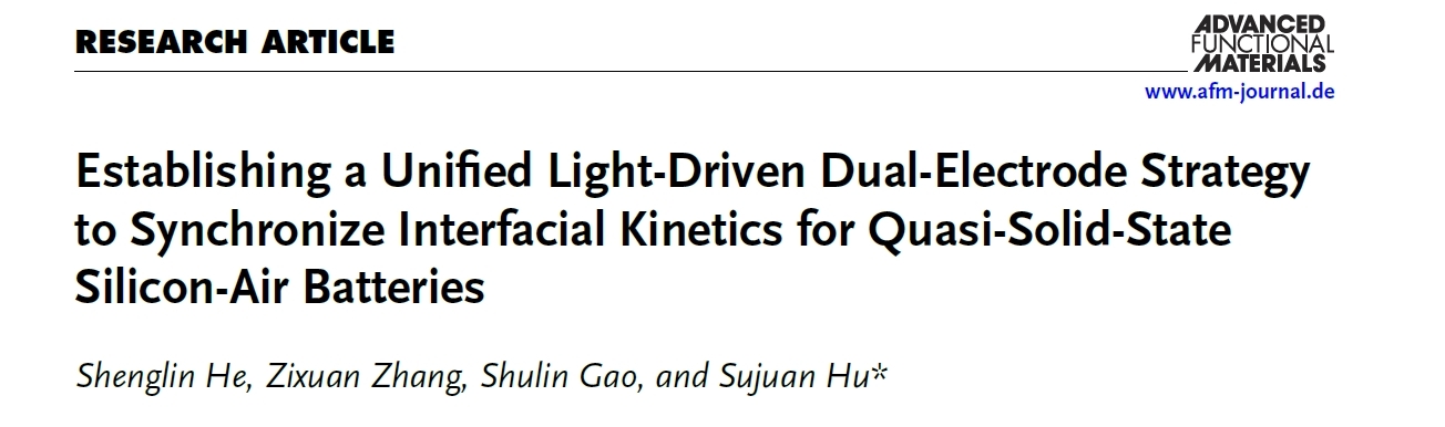 近日,best365胡素娟教授团队以best365足球官网为唯一署名单位,在材料科学领域国际顶级期刊《Advanced Functional Materials》(中科院一区TOP期刊,IF=19.0)发表题为“Establishing a Unified Light-Driven Dual-Electrode Strategy to Synchronize Interfacial Kinetics for Quasi-Solid-State Silicon-Air Batteries” 的研究论文。材料与化工专业的研究生何胜林和张子璇为共同第一作者,胡素娟教授为唯一通讯作者。