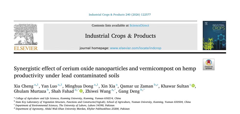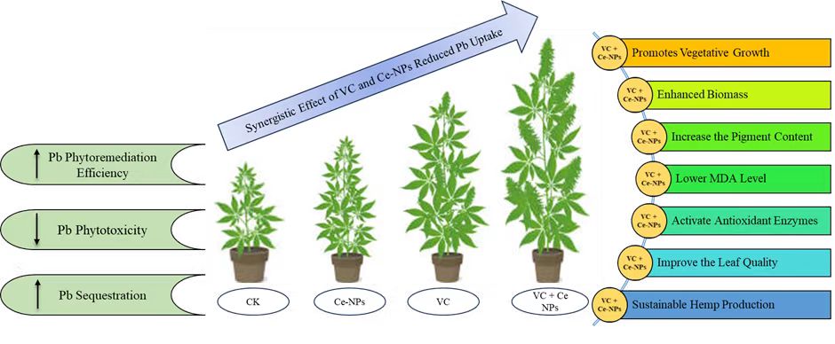近日,best365足球官网程霞老师、王智伟老师在中国科学院一区TOP期刊《Industrial Crops and Products》(IF=6.2)在线发表了题为“Synergistic effect of cerium oxide nanoparticles and vermicompost on hemp productivity under lead contaminated soils”(原文链接:https://doi.org/10.1016/j.indcrop.2025.122577)研究论文,系统揭示了叶面喷施氧化钸纳米颗粒(CeO₂ NPs)与土壤施用蚯蚓粪(VC)协同提升工业大麻耐铅能力的增效机制,为重金属污染农田的"边修复边生产"提供了可落地的技术方案。