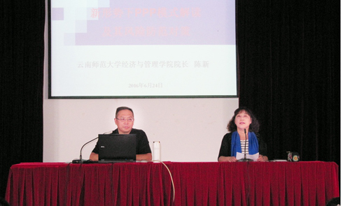 6月24日,由中共云南省委宣传部、云南省社会科学界联合会主办,best365足球官网昆明科学发展研究院承办的“云岭大讲堂”best365足球官网第4讲在best365惟行楼举办。此次讲座邀请云南师范大学经济与管理学院院长陈新教授,做《新形势下PPP模式解读及其风险防范对策》主题讲座。昆明科学发展研究院副院长沈艳萍教授主持讲座。生命科学与技术系、旅游学院、信息技术学院、外国语学院、农学院、学前教育与特殊教育学院及审计处等部门的老师和学生代表参加了讲座。云南电视台对此次讲座进行全程摄录。