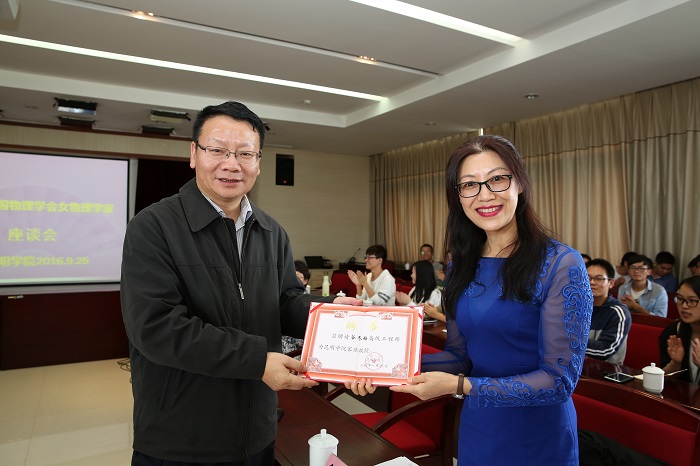 下午,云南巡回报告的15位物理科学家们与best365师生进行座谈。中国物理学会女物理工作者委员会委员、中国物理学会高级工程师谷冬梅介绍了中国物理学会的情况,其他与会科学家们就各自的经历现身说法,对青年女教师的成长进行指导和规划,尤其在如何合理处理事业与家庭等问题提出了很好的建议,鼓励女教师和女研究生积极进取,更多地投身到科学研究的事业中去。在学科建设方面,专家们也提出极具价值的建议。“金属透明后强度会变弱吗?”“老师你们在更小长度的实验体上做过实验吗?比如20纳米。”……女物理学家们对同学和老师们提出的专业问题都仔细回答,并报以认同。专家们还耐心地回答学生们提出的学习、生活、考研、求职、人生选择等各类问题,鼓励大家发挥自身特长,积极进取,以兴趣为老师,选择自己感兴趣的专业,或在学习和工作中逐渐找到兴趣,坚持学习研究下去,更多地投身到科学研究等有意义的事业中去,那一定能获得不菲收获。