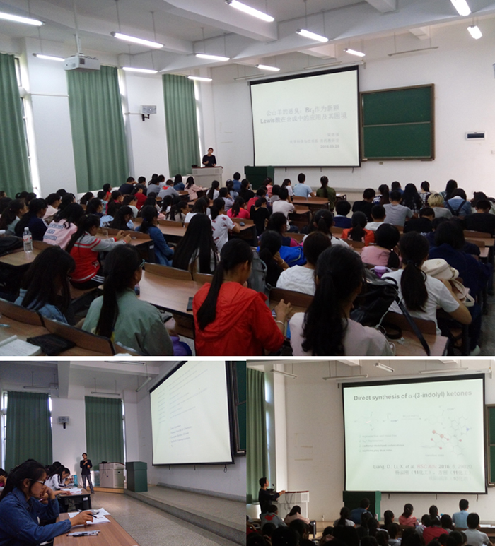 梁德强老师从卤素单质的重要性和现代分子卤素化学的研究现状出发,阐述了溴素作为一类新颖却未被开发的Lewis酸的研究价值,进而介绍了本系近年来在溴效应及其它领域的研究进展,并通过分享科研过程中的心理历程和实验室故事,激励同学们积极进取、有机会的话参与到科学研究的工作中来。