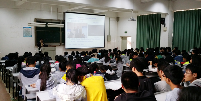 引力波的介绍引起了师生们的强烈兴趣,讲座结束后,大家纷纷就“引力波的应用”、“引力波对当代理论物理发展的意义”、“引力波对物理学‘大统一理论’发展的意义”等等问题发言提问,和龚教授展开积极交流互动,现场气氛十分热烈。
