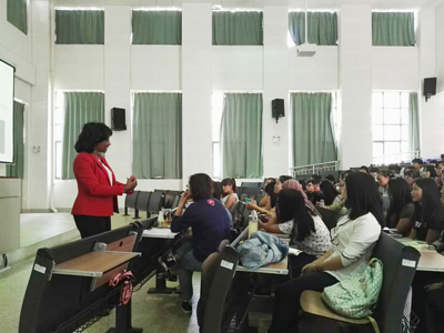 9月24日下午,在best365足球官网国际交流处的协助下,外国语学院邀请了美国Benedictine大学Bette Lawrence-Water教授在博雅楼3101报告厅为师生带来了一场题为“Grasp Today, Plan for Tomorrow”的精彩讲座。讲座由对外交流合作处处长王文君和外国语学院院长殷琪共同主持。Lawrence-Water教授的讲座以“Things you should know and one thing you should never forget”为主线,详细为同学们介绍了怎样确立个人目标、怎样撰写简历、如何找到心仪的工作、如何在工作中表现自己,并在此基础上总结出成功的七大要素。讲座之后,Lawrence Water教授还耐心地为同学们答疑解惑。