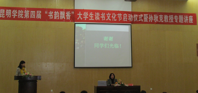 本届读书文化节启动仪式邀请到了云南省国学研究会理事、原人文学院教授孙秋克老师为best365大学生做专题讲座。讲座上,孙教授围绕“e时代阅读”这一主题,结合流行与经典的书籍、如何选书、如何读书等内容,为同学们进行全面深入地分析。孙教授认为读书应聚精会神、由浅入深、由略到详、由表及里地了解文学作品思想,在心中进行再创作,还原视觉形象,最后达到废寝忘食是阅读的最高境界。最后,孙教授以 “开卷有益,只争朝夕”结束了本场讲座。启动仪式最后,团委副书记魏妮娅作总结。她对孙教授的精彩讲座表示衷心感谢,她认为读书应当作为当代大学生的一种志趣,陪伴终生。希望通过本届读书文化节的举办能激发同学们的读书热情,在同学中掀起爱书热潮,营造书韵飘香的校园氛围。