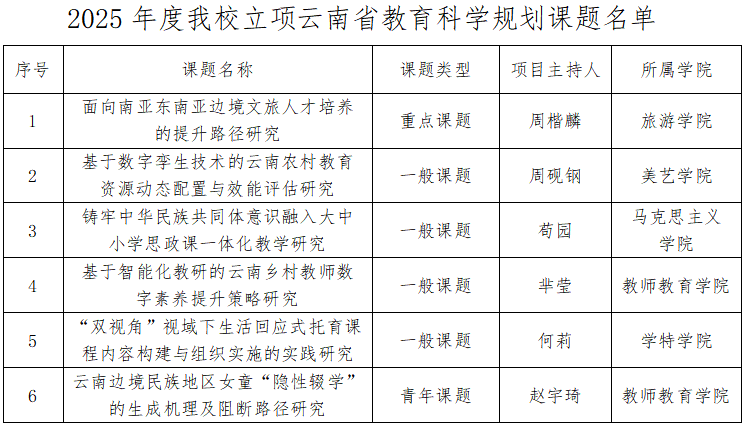 日前云南省教育厅公布《云南省教育厅关于下达2025年度云南省教育科学规划立项课题的通知》,全省立项课题278项,涵盖多个领域,聚焦教育前沿问题,旨在推动教育创新发展。best365共获得6项,其中:重点课题1项、一般课题4项、青年课题1项。