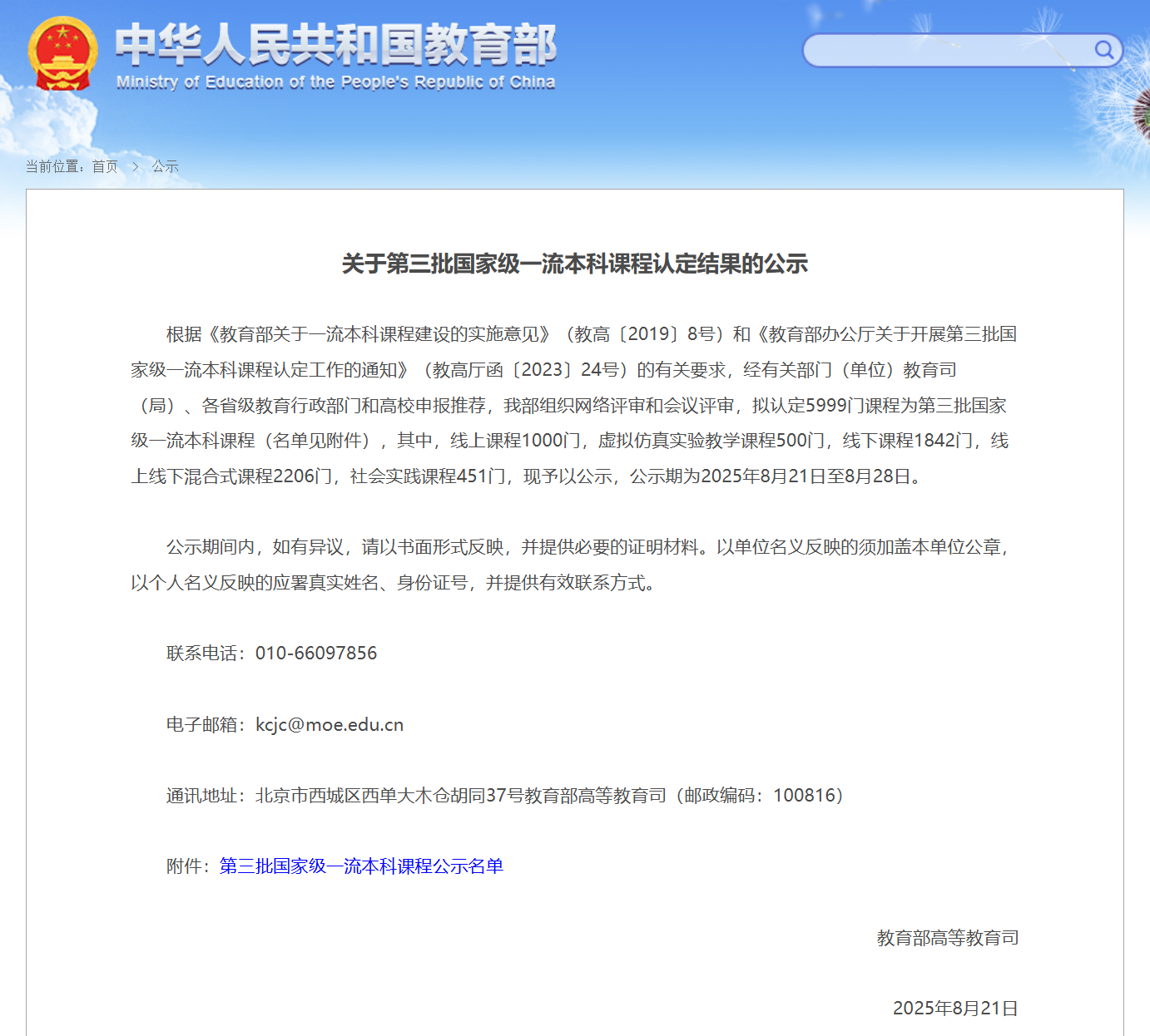 8月22日,教育部网站发布《关于第三批国家级一流本科课程认定结果的公示》,best3654门课程成功入选,分别为:学特学院高春玲教授《幼儿园管理》、旅游学院田芙蓉教授《餐饮运营管理》、农生学院侯秀丽教授《生态学》、人文学院孙雪莹副教授《纪录片与专题片研究》。这是学校首次获批国家级一流课程,是在课程建设中取得的重大突破。